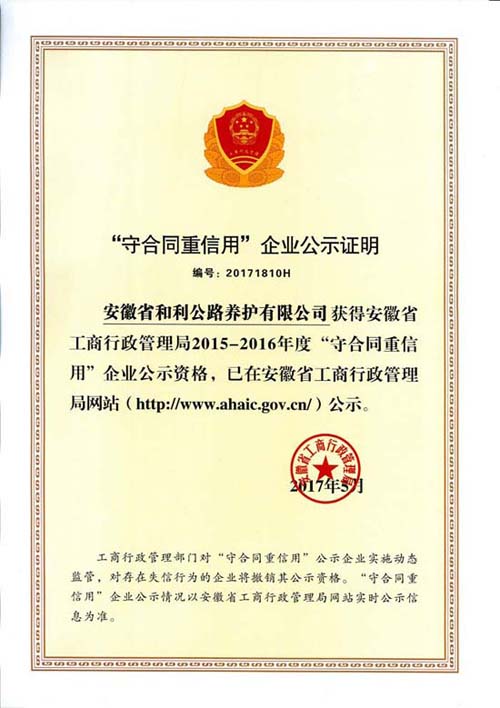 和利公司榮獲省“守重”企業榮譽稱號 時間:2017-06-29 08:31作者:admin 點擊: 次 祝賀安徽省和利公路養護有限公司榮獲省工商行政管理局2015-2016年度“守合同重信用”企業榮譽稱號。 ------分隔線---------------------------- 上一篇:防范和打擊非法集資 下一篇:喜訊 收藏 推薦 打印